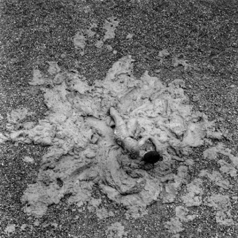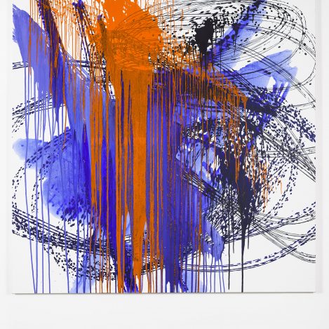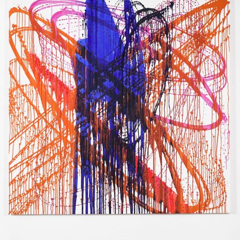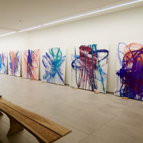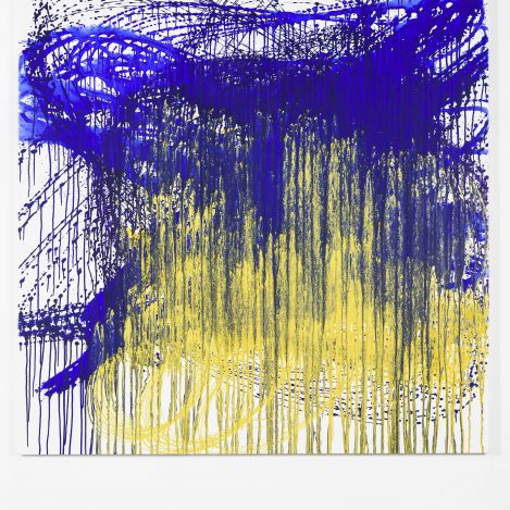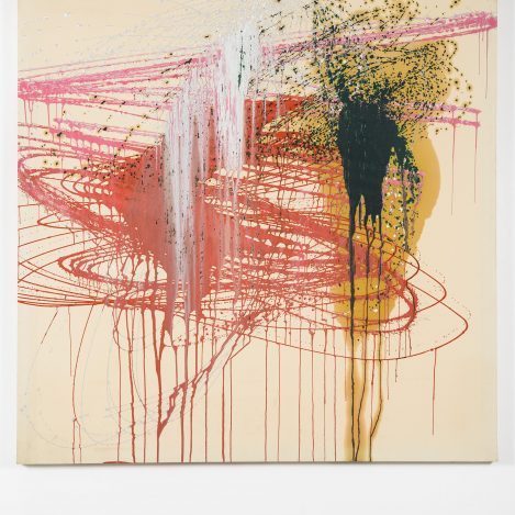 The Dutch artist Jeroen Doorenweerd (b. 1962) feels a kinship with the Japanese group despite the decades and thousands of kilometres between them. Gutai’s mentality and energy mirror his own. Though best known for his public artworks, in recent years Doorenweerd has been making paintings too. He might create a work by moving a bucket of paint above a canvas, or staging a “painting battle” with his friend and colleague Koen Delaere, or rolling out a large canvas on the beach and painting thick lines across it. This is painting as document of place, time and energy; the result of a painting action, a gesture, a state of being that is deeply personal.