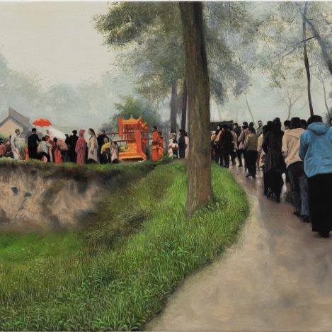 Zhang Shujian’s work lacks a clear narrative or concrete ideology. In this sense, his work avoids contemporary themes of politics or personal identity. With his idiosyncratic perspective of things, he touches on the more universal question of what it is that defines us as human beings, and examines an underlying reality that we either fail or refuse to see. Particularly revealing is his title for a series of portraits begun in 2015, Fellaheen – a term used by Oswald Spengler for the detached masses who are outsiders within a civilisation that has been disengaged from its original cultural vitality. Zhang Shujian portrays the fellaheen (Fellaheen 6, 2016) of modern Chinese society. In his most recent works, which for the first time feature group scenes, he places these fellaheen in relation to each other and their ambience. These are not images of the new China with its modern mega-cities and fashionably dressed young people. A Break, 2021 is more of a village scene, as they are still to be found within the same mega-cities. The Fellaheen as a kind of modern nomads in the big city. In Ongoing Ceremony, 2021 we see a traditional procession, but one that seems to toil along almost mechanically and cheerlessly, detached from its original cultural breeding ground. While refraining from passing judgment on this, Zhang Shujian’s work offers a merciless glimpse of the social fabric of the present-day materialistic Chinese society.
