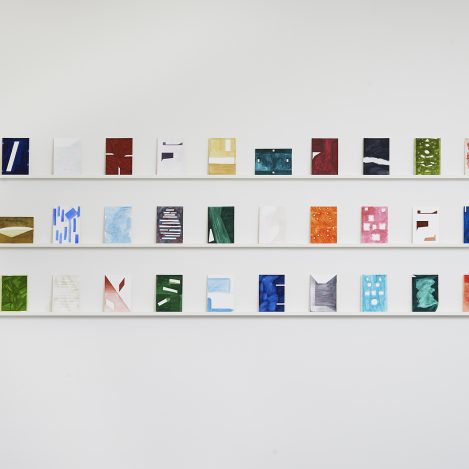 His paintings, of which he makes only about ten a year, evolve out of watercolour drawings in which the artist conducts a continuous process of discovery and investigation. These drawings comprise the heart of Holyhead’s artistic practice and can be seen as detailed investigations into colour, form, and the behaviour and capacities of paint; into space, scale, and the unity of the image. From these studies, Holyhead starts to select particular sensibilities that have potential but whose transfer to canvas nevertheless carries risks.
